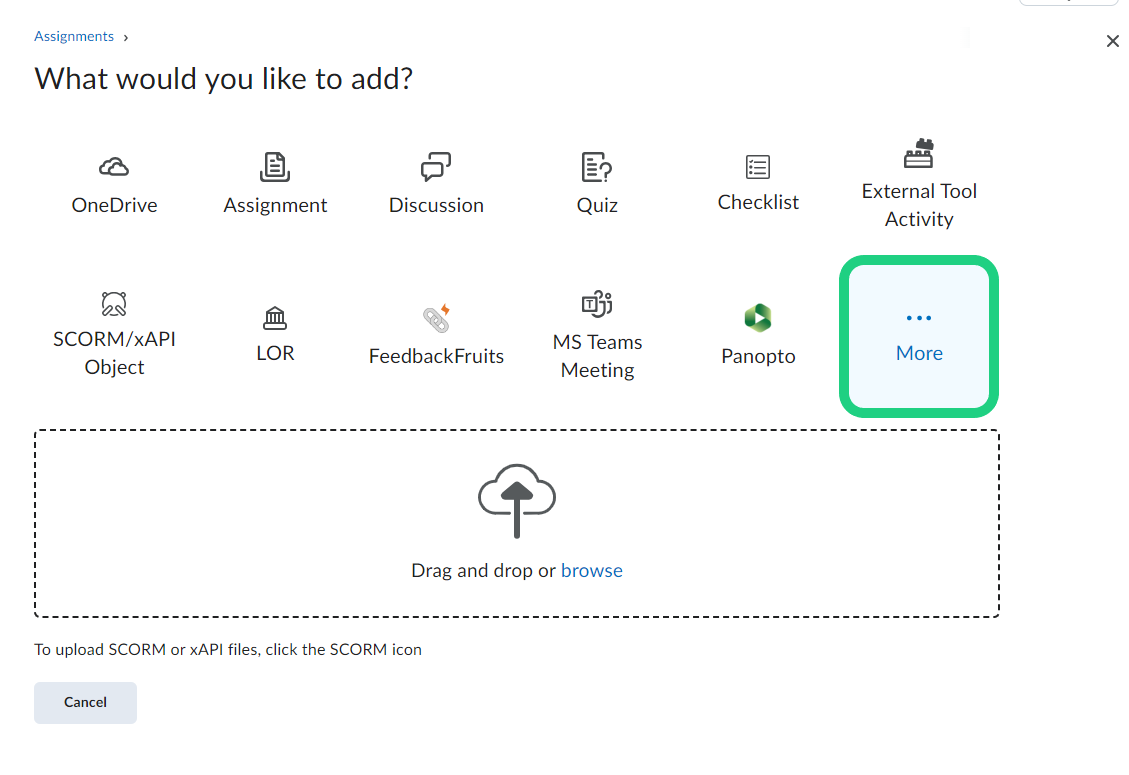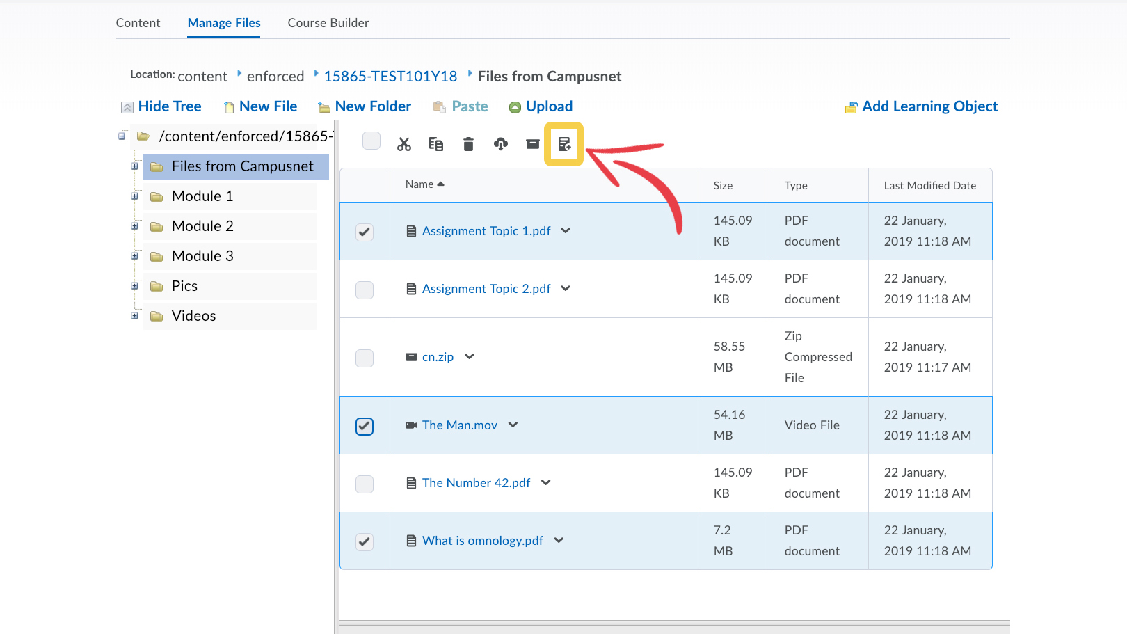 When you have uploaded content through Manage Files, you can add it to the content of your course in two different ways. One way is from the Manage files tool, and is recommended if you are working with several files and folders. If you just need to apply one file to your content, you might find is easier to use the second option.