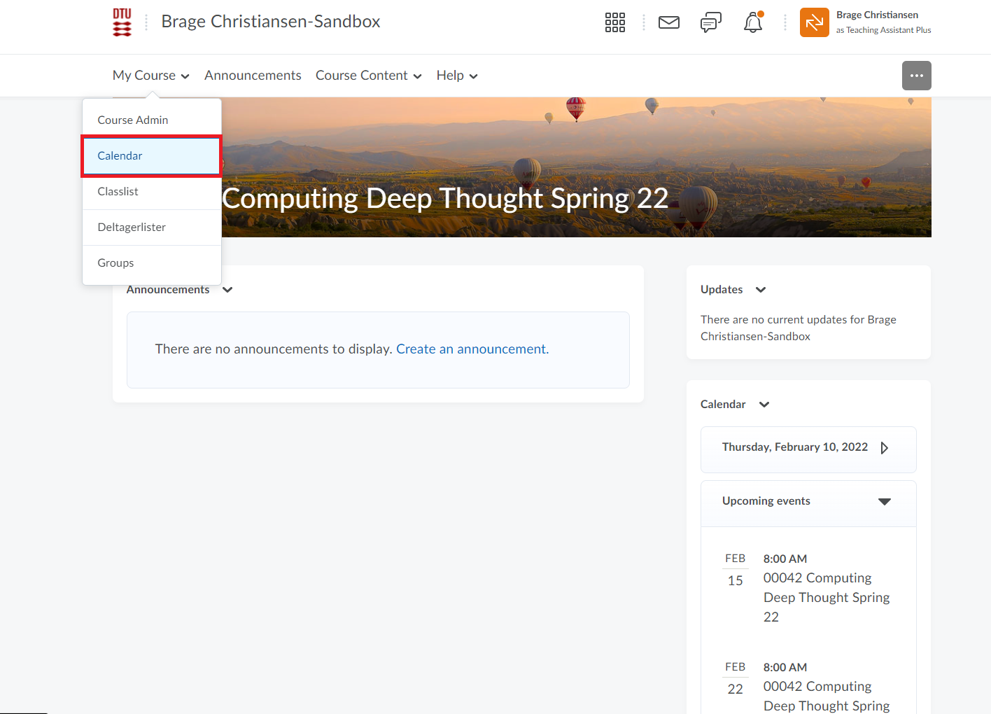 - From the course homepage on DTU Learn go to "My Course" and then click "Calendar".