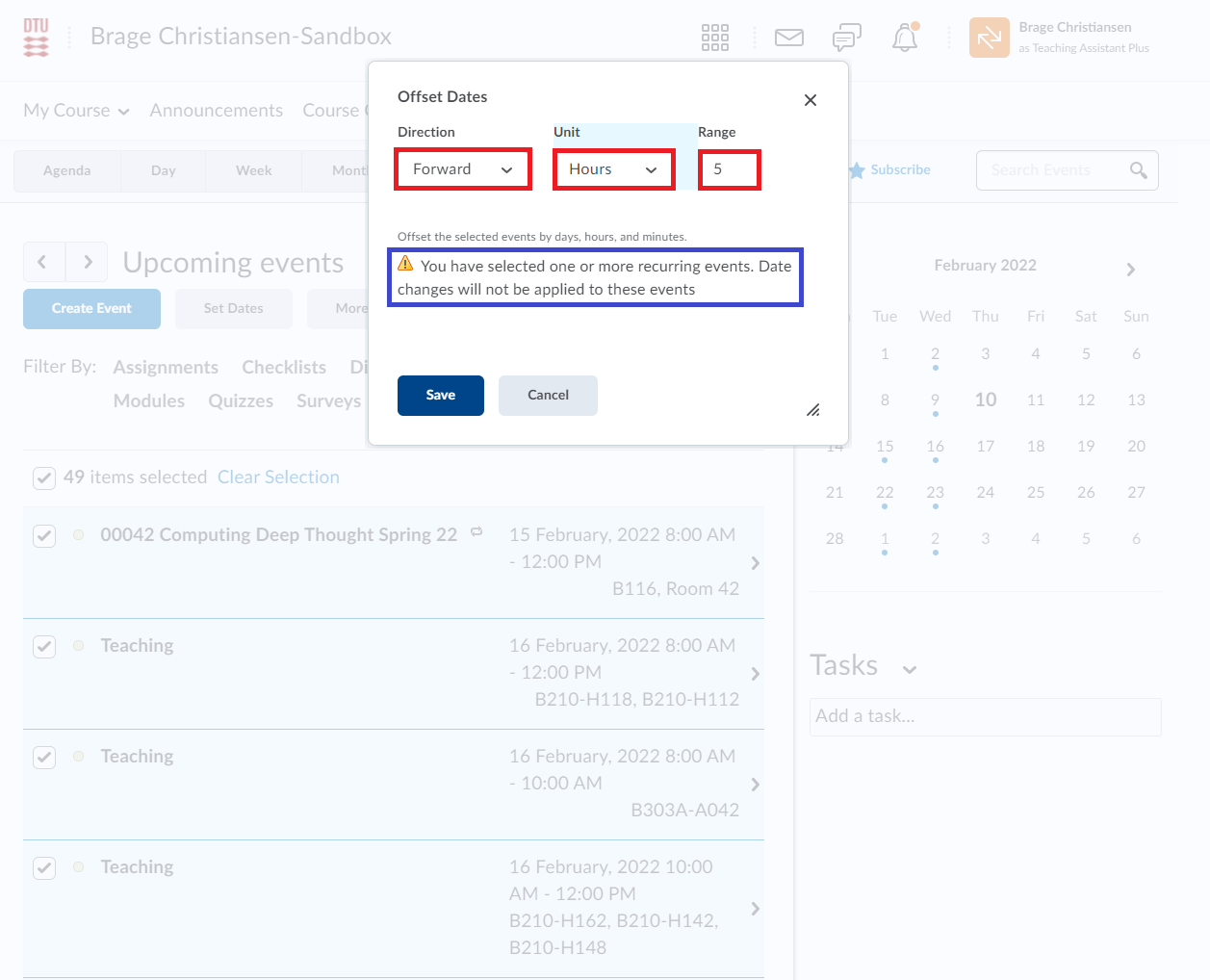 - Automatically created events can be edited or deleted in DTU Learn. However, they will reappear or overwrite if they are edited or deleted in TimeEdit afterwards. To permanently edit or remove an event, edit or delete it in TimeEdit first, then in DTU Learn.