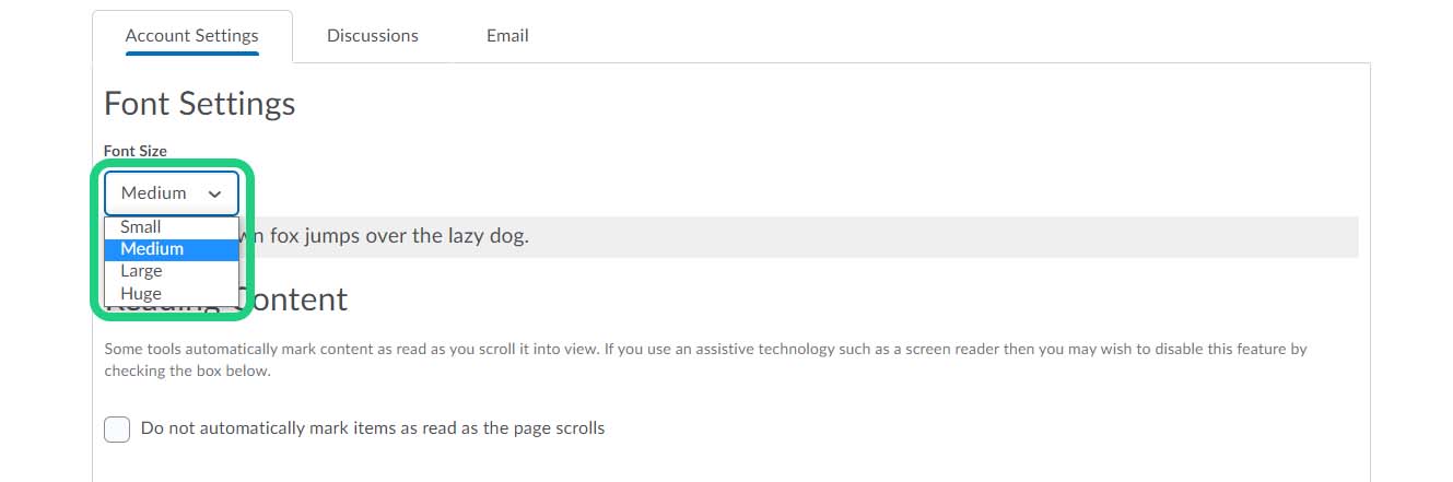Scroll to "Font Size" and open the dropdown menu. You can now choose your preferred font size.