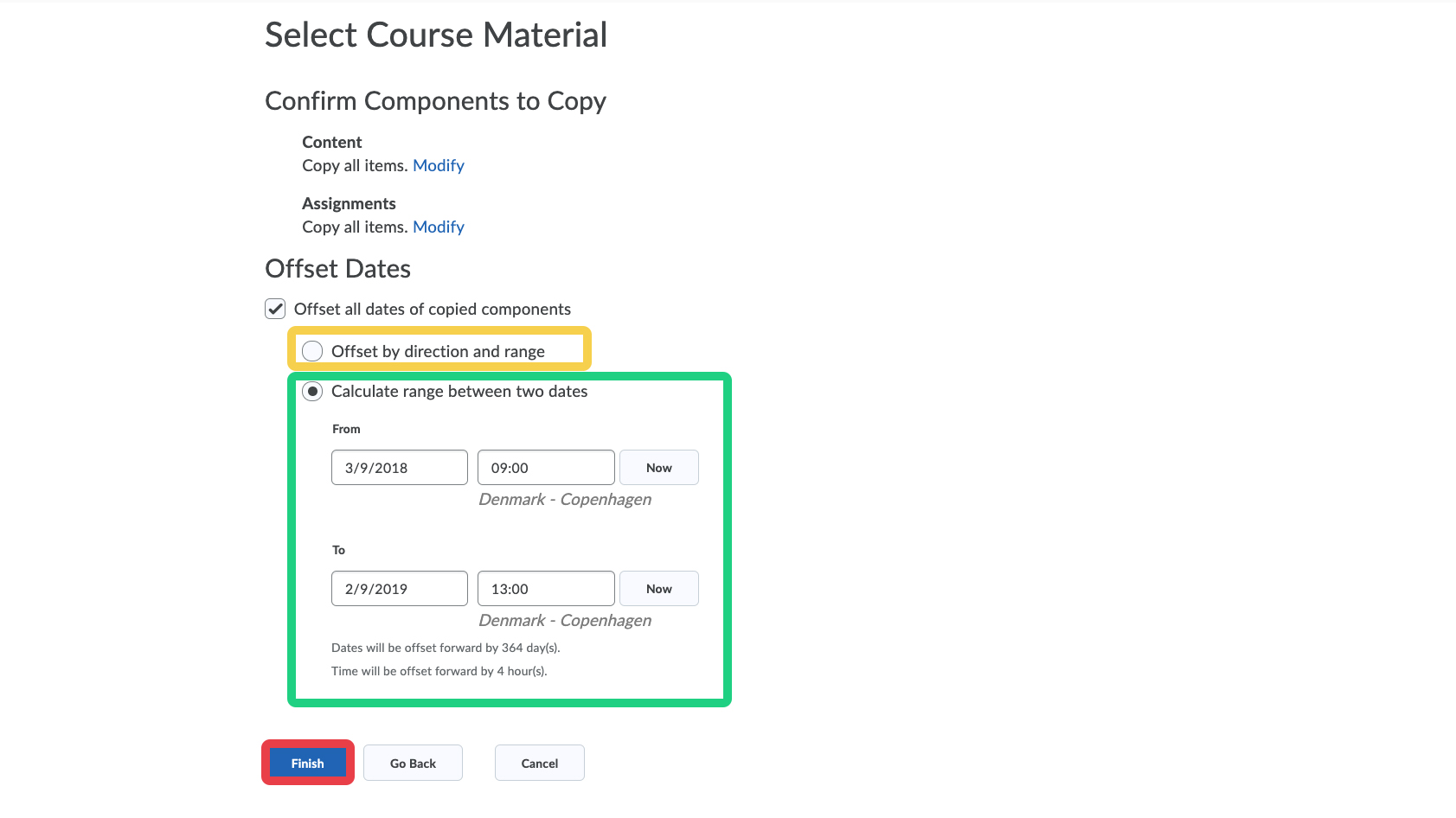 - If you have specified dates (due dates, start dates, end dates) for the items you are copying, you can offset these dates to the new semester. You can always change these dates at a later point, when you are working with your content. Click "Finish" when you are done.