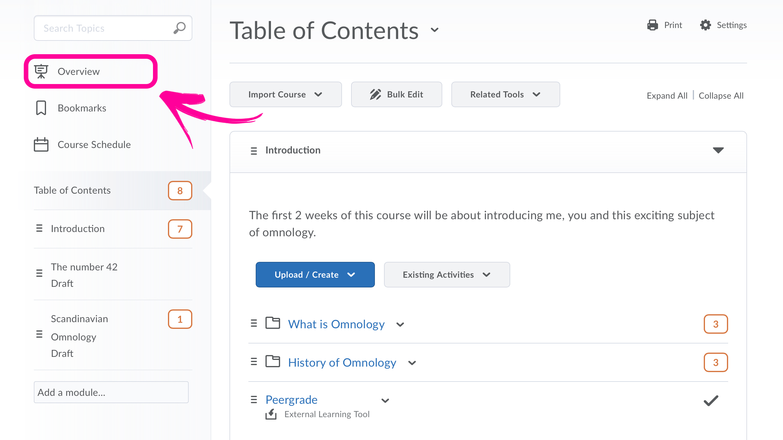 - Start out in your Course Content. Click Overview in the navigation overview on your left hand side of the page.