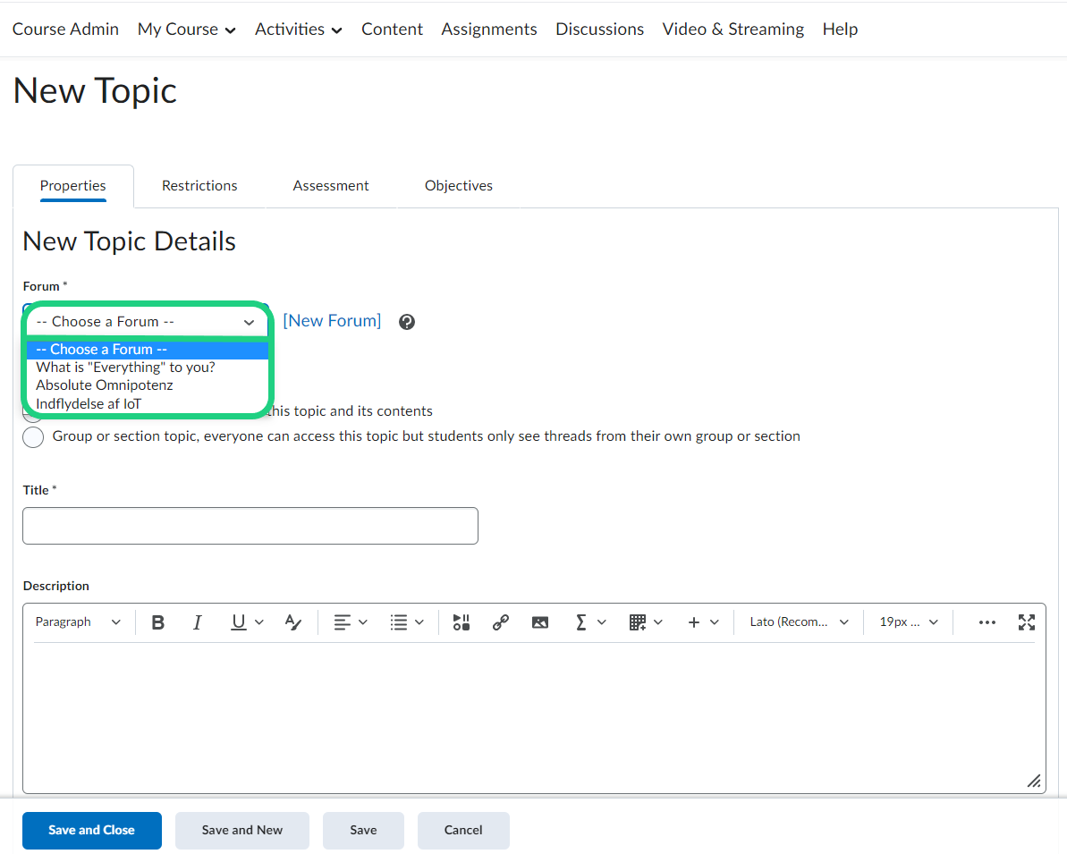 - Choose a topic type, title, and enter a description. You might want to change some options and maybe add a rating-system. When you are done editing, click Save and Close.