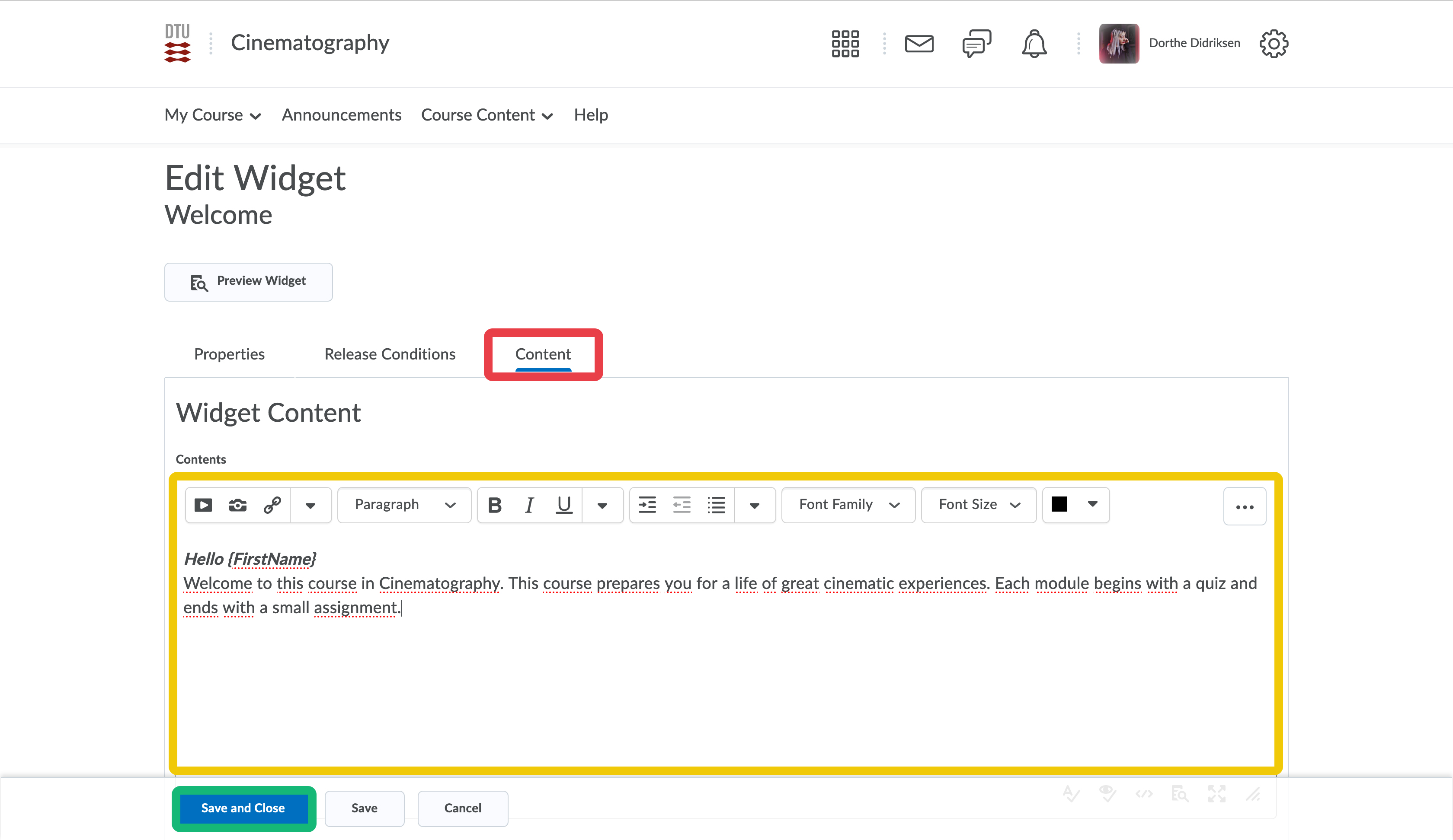 Select the Content tab, and you will see the HTML Editor. In the Widget Contents area, type the welcome messages for your learners to read. Add photos, videos or links if you like. If you wish to personalize the widget with e.g. "Hey (first name of user)" you can use replacement strings. Select "Save and Close".