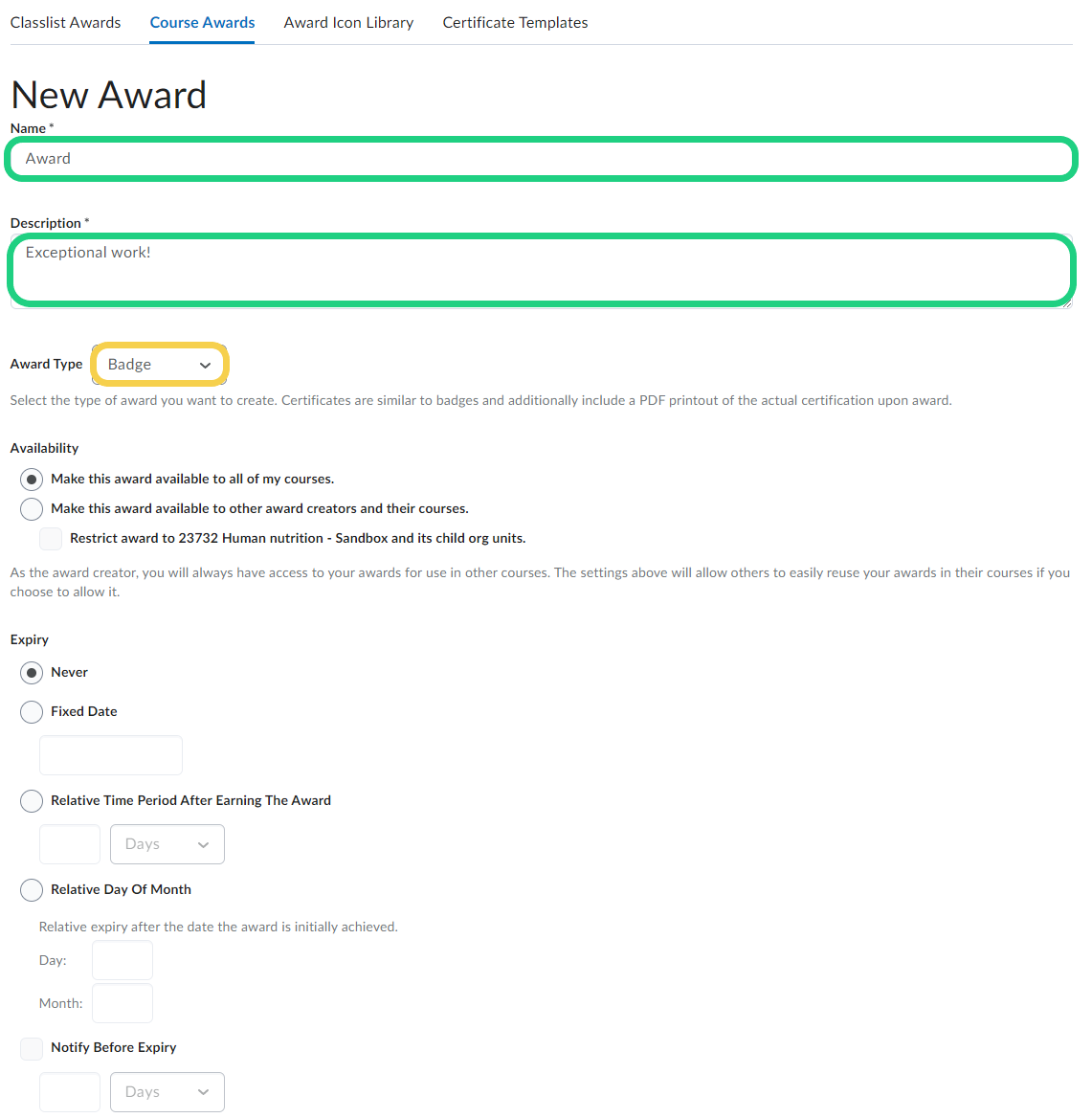 - When creating a new award, select a name and a description of the award. Also select an award type. There are also other functions you can personalize like availability and expiry.