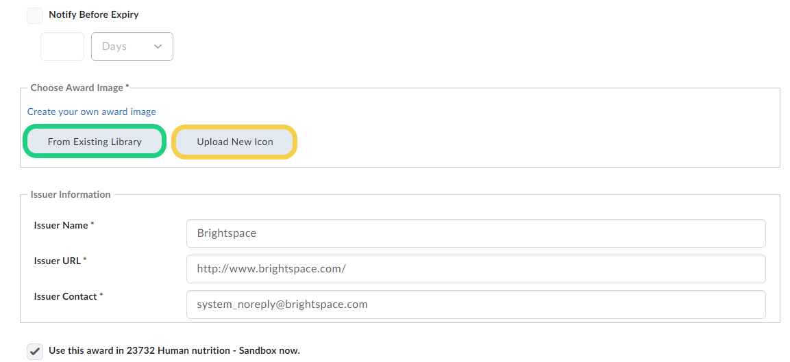 - Next you must choose an award image. If you want a new image from your computer to be used, click on "Upload New Icon". Alternatively you can choose an icon from the existing library by clicking on "From Existing Library".