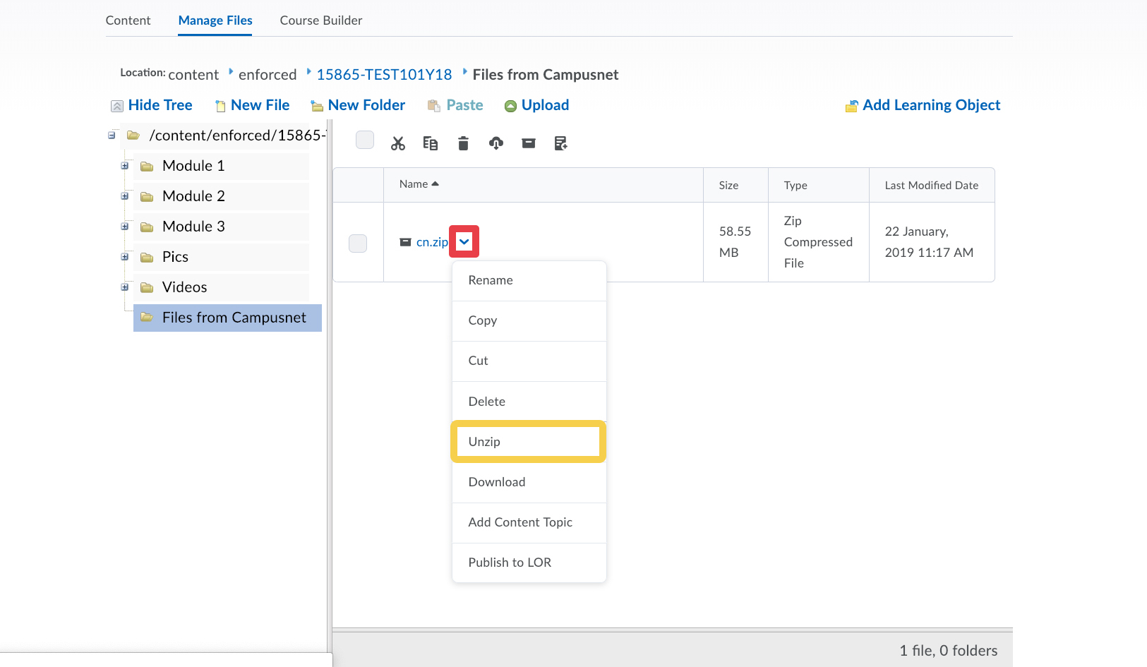 - When the file is uploaded, click on the small arrow to the right of the zip file and select Unzip.