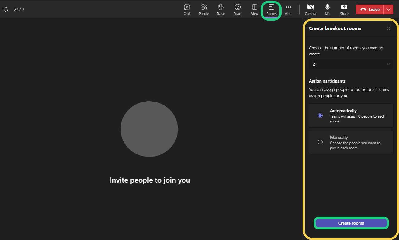 - Under 'Rooms' you can create breakoutrooms. After clicking on the icon you can specify the settings for the breakout rooms.