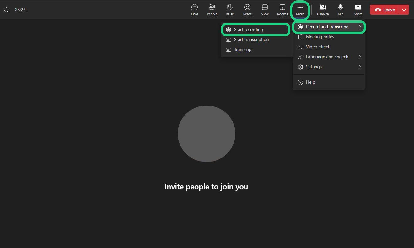 - By clicking on 'More' you can record an transcribe the meeting. Remember to upload the video to Panopto if desired. This guide gives more insight on the matter: Record a Meeting on Microsoft Teams