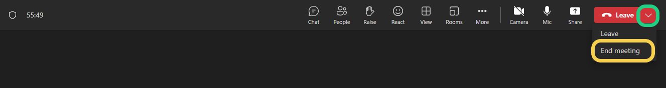 - By clicking on the arrow next to the 'Leave' button you have the option to end the meeting for every participant.