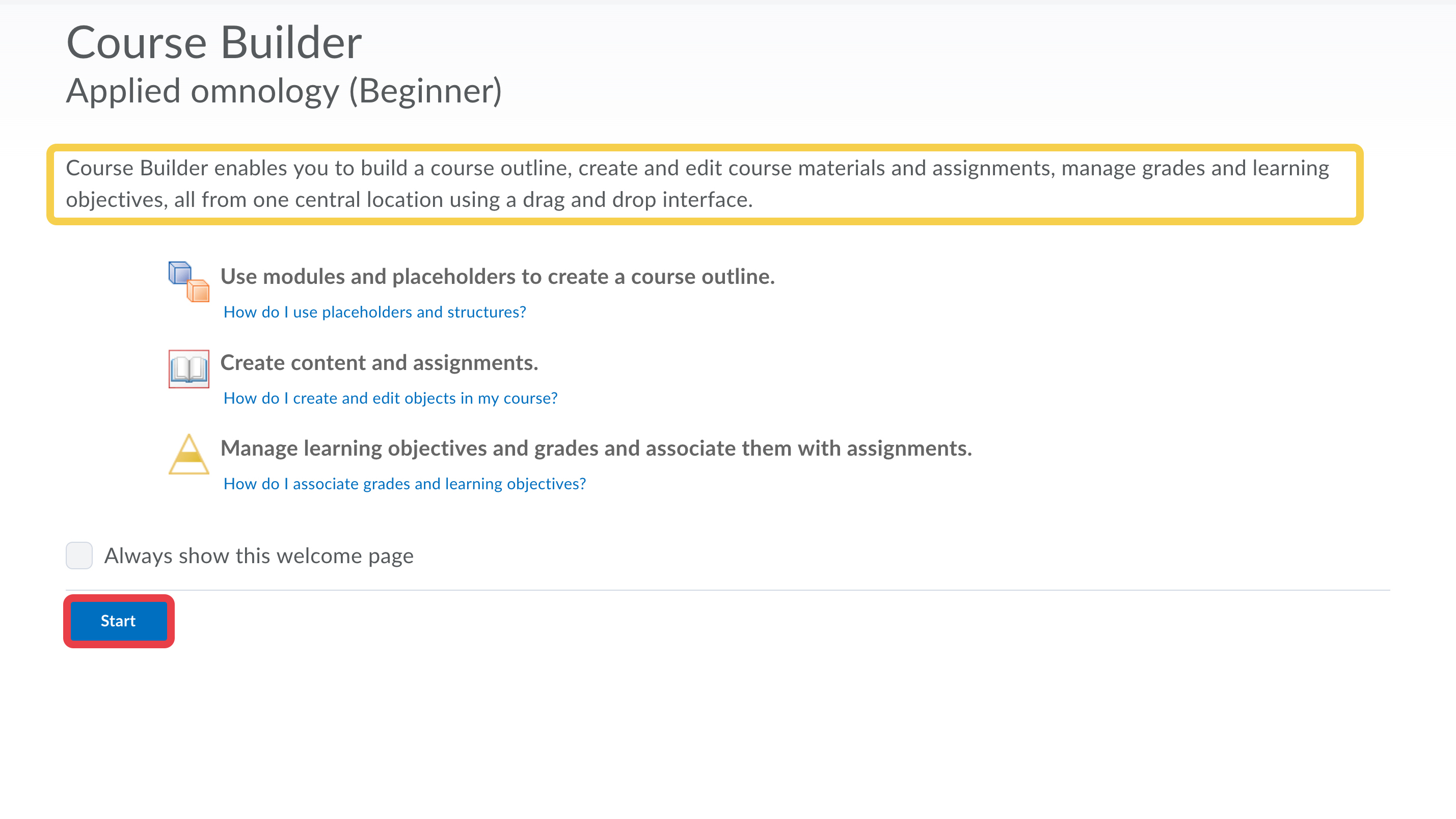 - This page explains about the course builder tool. When you are ready, select Start.