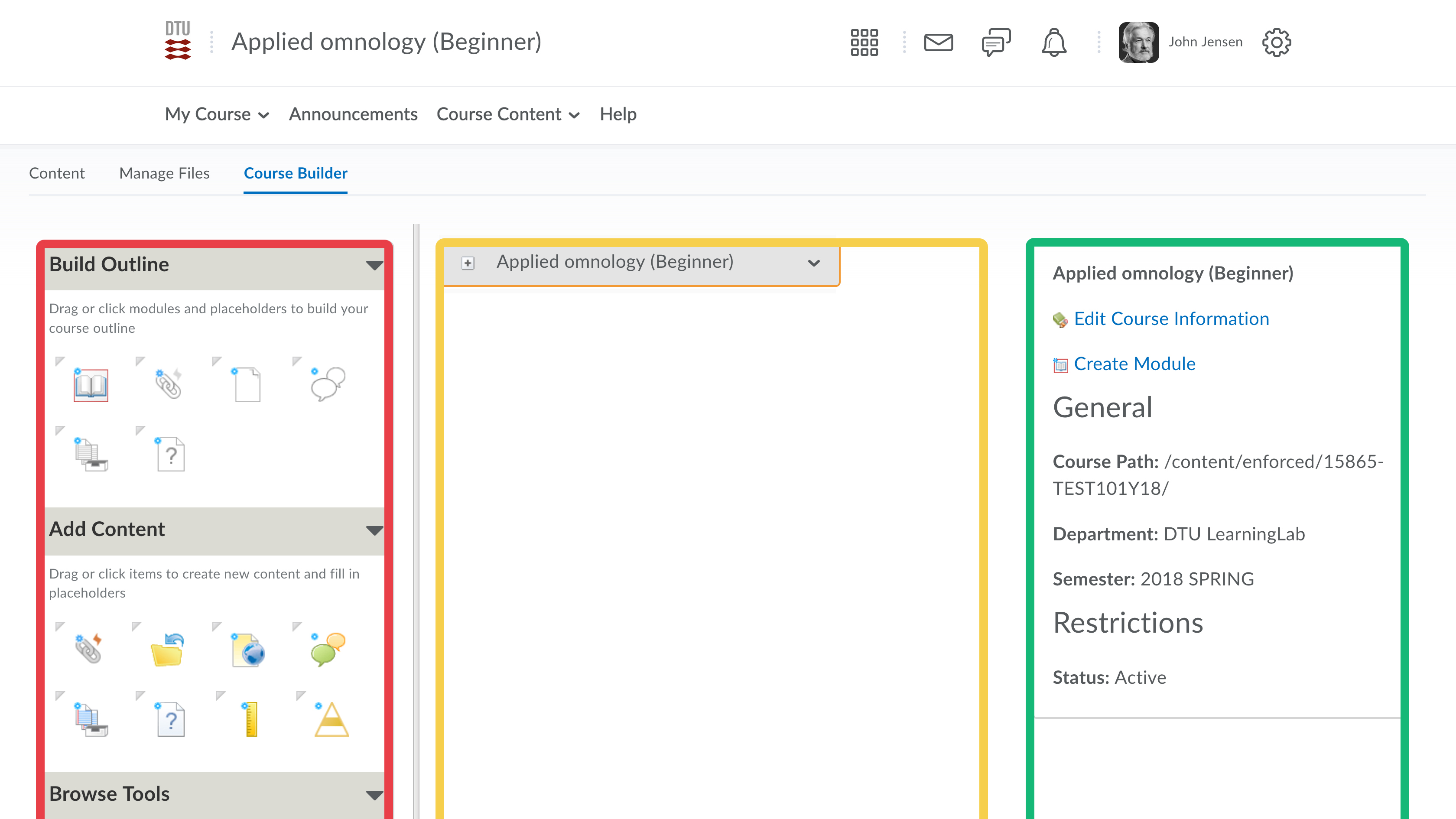 - The course builder consists of three columns. On your left hand side you can see three parts: Build Outline, Content, and Tools. At the center, you have the canvas. In a new course this part will be empty, (except for the course name). At your right hand side you can see a contextual display panel. This provides specific information regarding the highlighted element on your canvas.