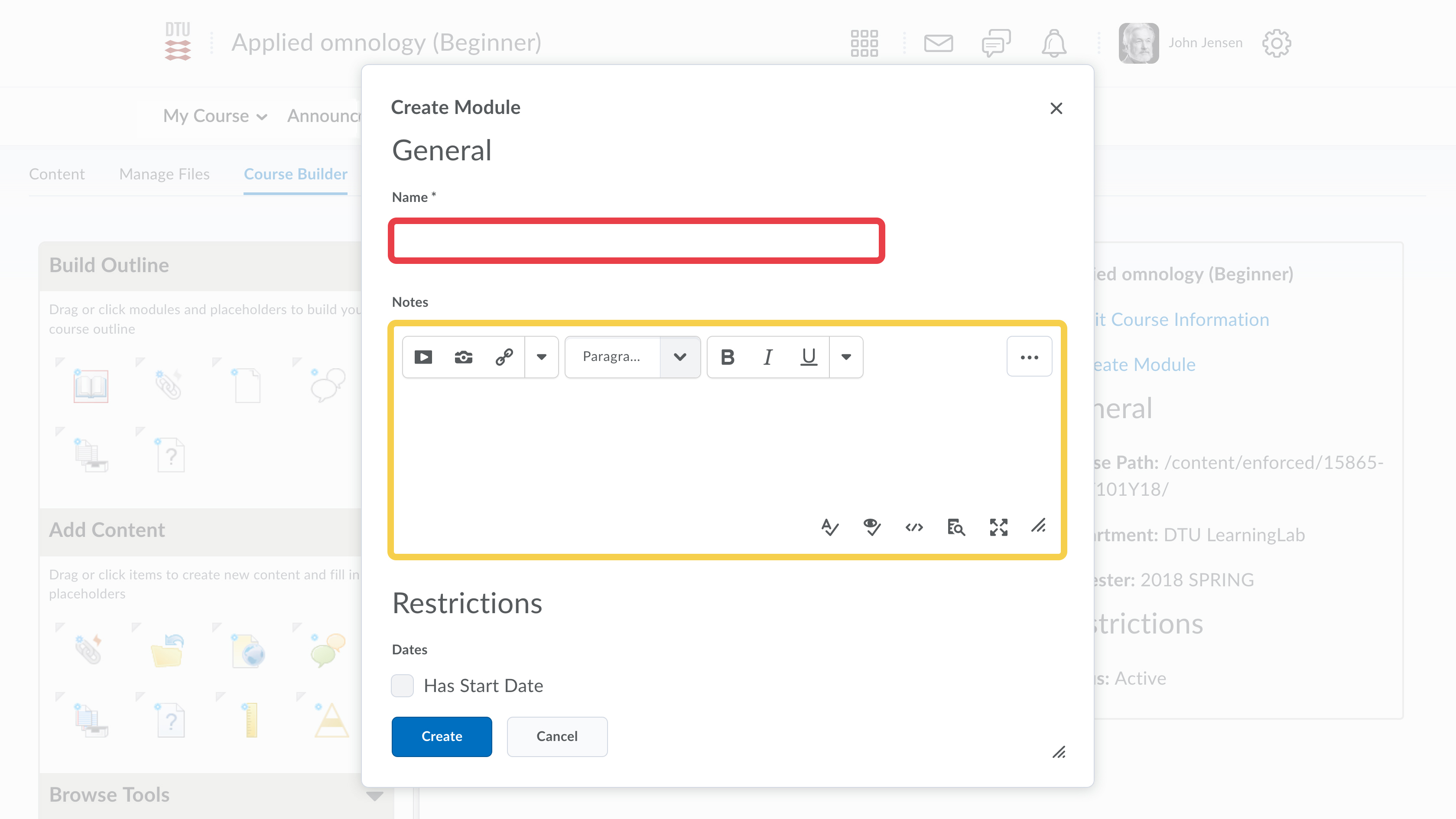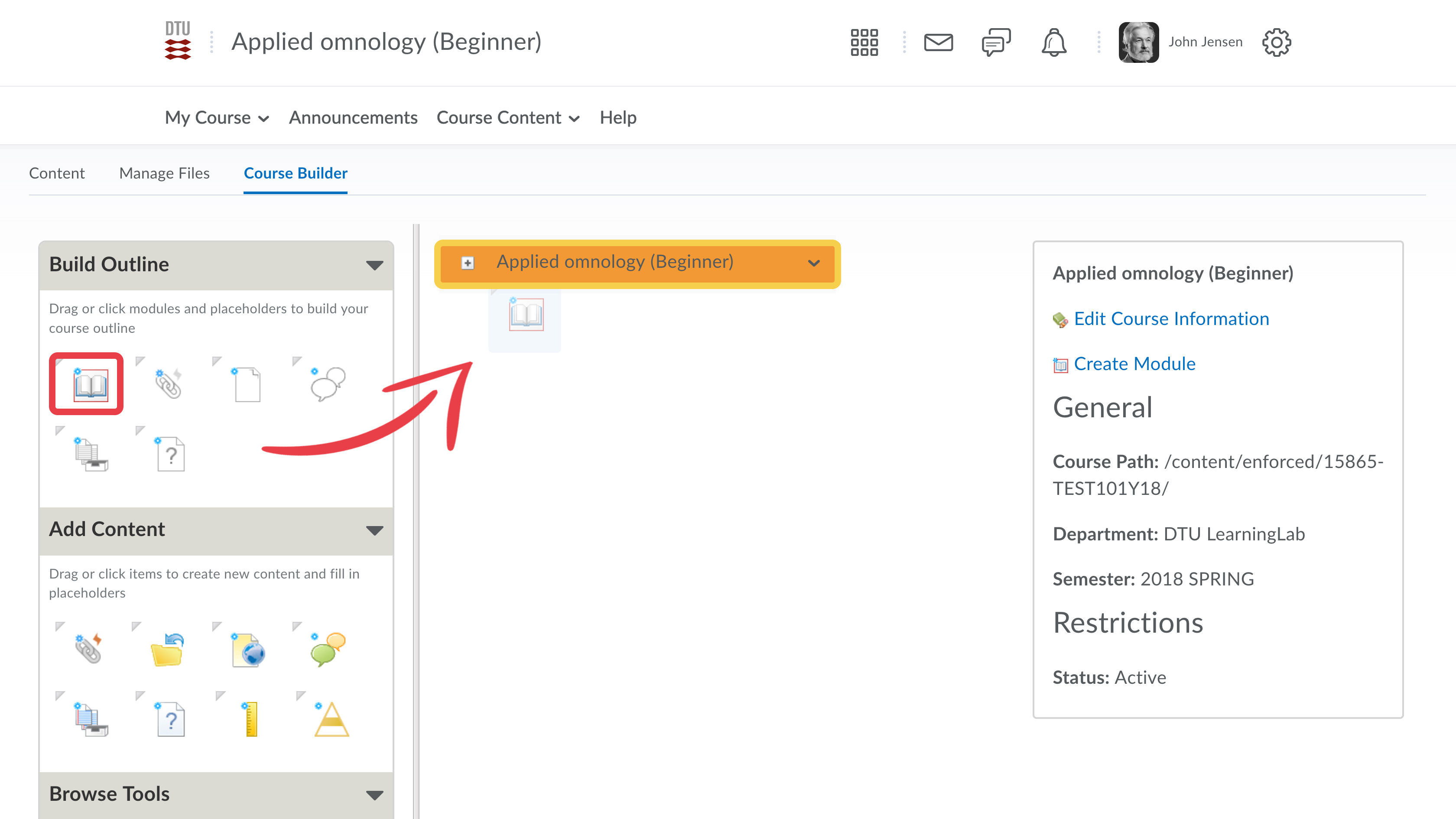 - The best way to create your course is to start building an outline. This will provide an easy overview of the course structure. Before starting you need to decide the narrative of your course. You can for example structure your course on weeks, modules, themes, tools or topics. Start by dragging the first module from the "Build Outline" to the canvas.